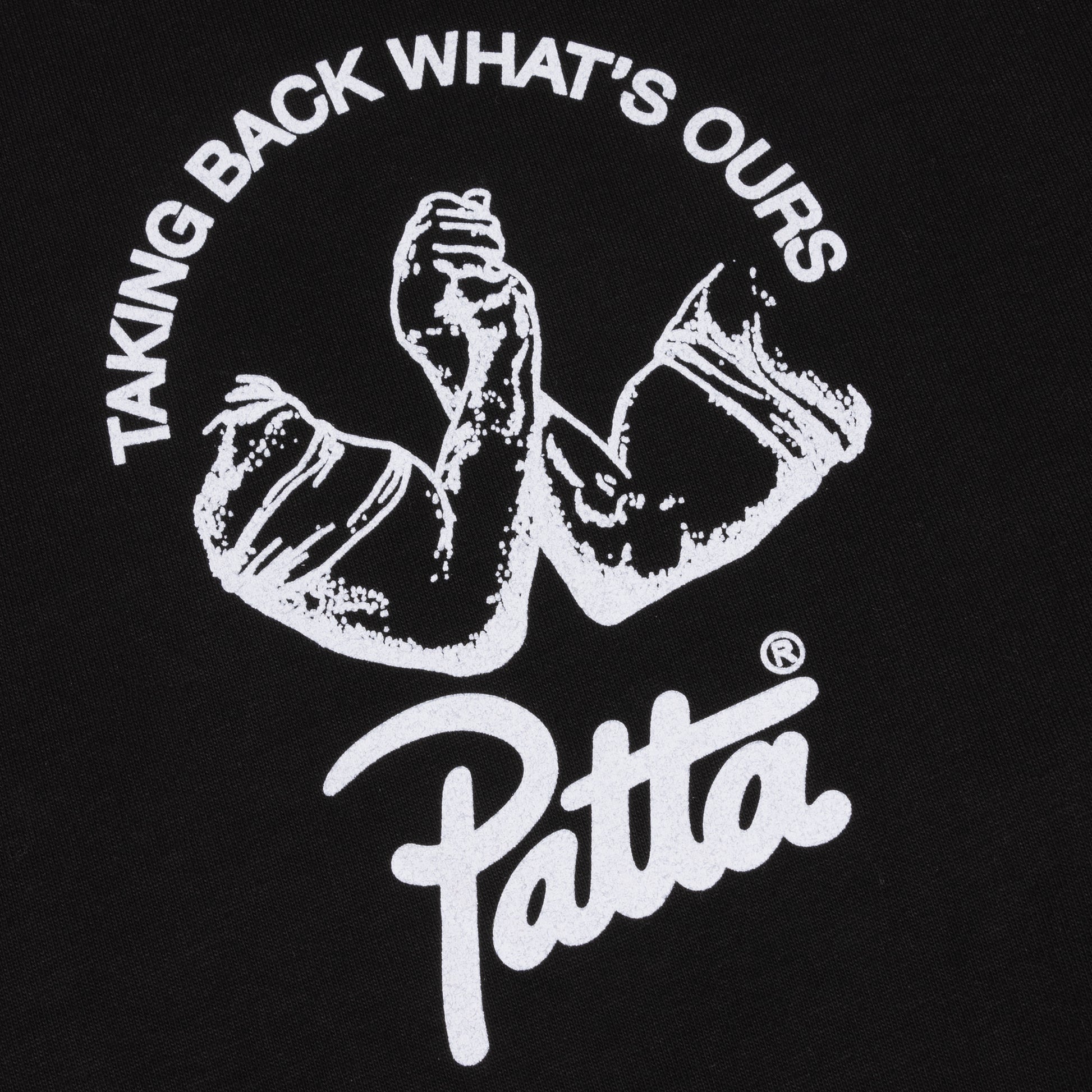 This design is about unity across borders. The front graphic shows two hands locked together with the message “Taking Back What’s Ours,” a reminder of strength in numbers and the power of community when we move as one.